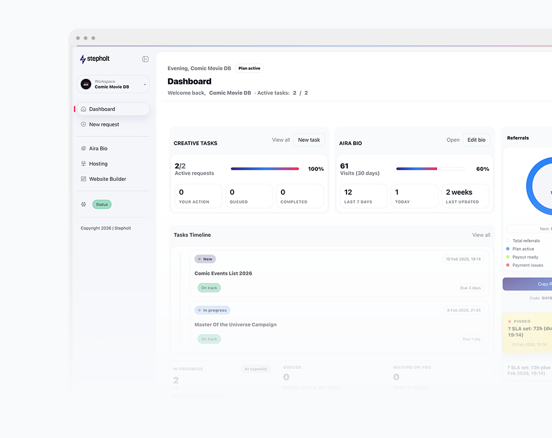 At Stepholt, requests are added to your dashboard, prioritised, and delivered continuously. No hourly billing. No constant renegotiation.